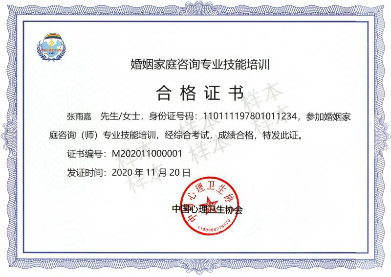 学员经过培训参加综合考核,通过者获得中国心理卫生协会颁发的婚姻家庭咨询(师)专业技能合格证书。