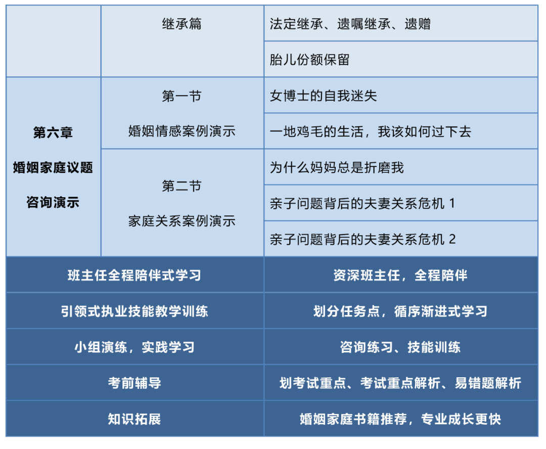 录播课程:专业系统的讲解婚姻家庭咨询的执业实操理论与技能,并透过案例,结合当今社会婚姻生活中的种种焦点问题,讲授婚姻家庭咨询的方法、脉络,使学员不仅掌握专业知识和技能,还可以从专业角度出发充分的自我成长,并将所学应用到生活中去,助人助己,使家庭和美,实现积极幸福的人生。直播课程:为了能使广大学员通过学习后真正做到学以致用,学期内全年组织每月一次的专业应用型直播课。从专业发展、婚姻家庭、亲子教育、职场应用等领域,多方面入手,全方位提高心理学在大众日常生活中的应用,从而提高大众的专业素养、生活品质、以及职场能力。直播课每月1次,每次90分钟,避开重大节假日,学员在学期间均可在自己的学习平台进行学习。
