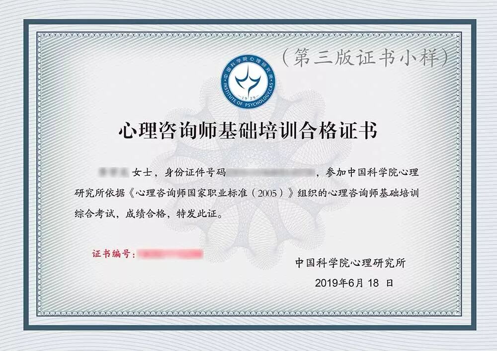 综合考试合格,由中国科学院心理研究所颁发《心理咨询师基础培训合格证书》。证书统一编号,中科院心理所网站提供查询(监督电话:010-64850860)